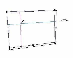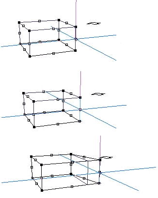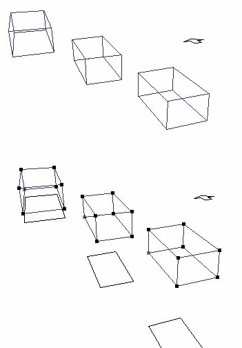 DesignWorkshopのインタフェースは、シンプルかつ重要な特色をもっていて、それによって、容易に3次元空間で正確に位置を決められます。これをスペースジャンプと呼び、ハンドルを掴むときの微妙な位置の狂いを避けたいときに使用します。スペースバーを押してスペースジャンプすると、2次元の位置にあるクロスヘアを、3次元の位置にあるハンドルに位置づけることができます。それでは、いろいろなハンドルにジャンプして試してみましょう。ツールパレットから選択ツールを選んで、ブロックを選択します。次に2次元クロスヘア(選択ツールを選んでいるときは、小さな十字マークがでています)を、3次元クロスヘアがある高さとは別の高さのハンドルに近づけて、スペースバーを押します。そうすると、3次元クロスヘアは、そのハンドルの位置にジャンプします。