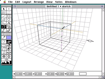 4. まず、2階建て程度の高さになるようにブロックを描きます。ブロックツールをクリックしてから、キーボードの0をたたいて、クロスヘアが地面上にくるようにします。そして、マウスをクリック、ドラッグして底面となる四角形を、背景のグリッドに乗るように描きます。マウスボタンを押したまま、マウスをもっていない方の手で、optionキーを押しっぱなしにしてマウスをドラッグ(optionドラッグ)して、ブロックに高さをつけます。このとき、ウィンドウ下のロケーションバーのVの値が変化するのを見て、20フィートの高さになるようにしてください。