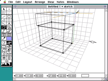 6. 次に屋根用のブロックを描きます。ツールパレットのブロックツールのアイコンは、まだ反転しているはずです。また、クロスヘアは、スペースジャンプによって、正しい高さにあるでしょう。したがって、クロスヘアを平面的に動かして描けばよいのです。ロケーションバーのZの値が20になっていることを確かめて、クロスヘアを南と西にそれぞれ1フィートずつ外に動かします。この点を起点にして、クロスヘアをロケーションバーが、E=27、S=22になるまで動かし、optionキーを押しこんで、そのままV=10になるまでドラッグします。このブロックを描いている最中に、投影線が地面上に描かれ続けていることに留意してください。この投影線を屋根のブロックの位置や大きさを決めるために使ってください。このような投影線は、パース画面の中で奥行きを知るための手助けとなる重要なものです。