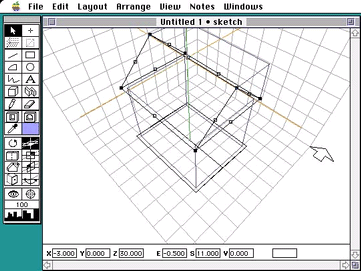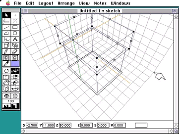 この3次元クロスヘアが、DesignWorkshopのモデリングの基本ツールです。マウスを前に動かすと、クロスヘアはモデリング空間の奥へと移動し、マウスを手前に引っ張るとクロスヘアも手前、すなわち南側に移動します。3次元クロスヘアが、パースペクティブに見えるモデリング空間の中であちこちへ動くのを観察してみてください。