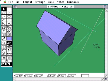 9. アイツールを選んで、クロスヘアを動かして、自分がつくった作品を鑑賞すると同時に、DesignWorkshopのダイナミックな視点移動を楽しんでください。十分楽しんだら、モデルをつくったときように、東立面が見える俯瞰の視点に戻してください。