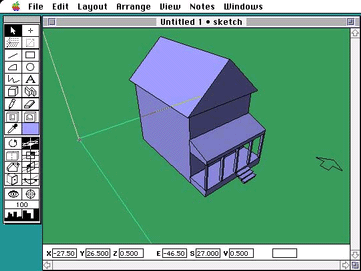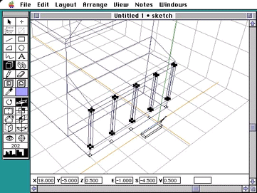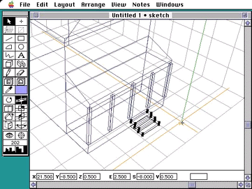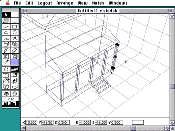 ポーチの柱の投影線が階段づくりの手助けになります。0をタイプしてクロスヘアを地面に降ろし、真ん中の柱の北手前の頂点まで動かして、スペースバーをたたきます。これで、ロケーションバーの相対値(E,S,Vの値)がすべてゼロになます。ただし、クロスヘアの後ろに何もオブジェクトがなかったならば、クロスヘアは動きません。相対的な位置をゼロにすることによって、E,S,Vの値を、次のオブジェクトまでの距離を測ることに使えます。