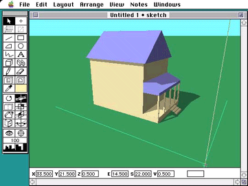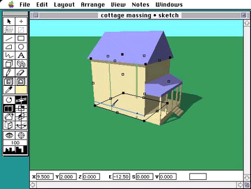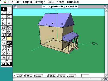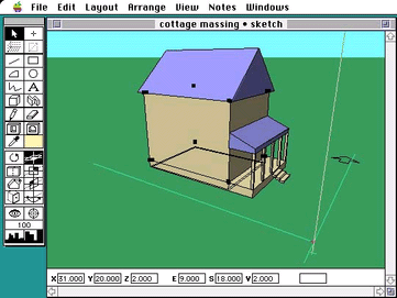 1. 建築デザインにおいては、マスモデルづくりから始めて、そのマスモデルに穴をあけて、内部空間をもつモデル(空間モデル)構成していくことが多くあります。DesignWorkshopでは、壁作成コマンドを使ってマスモデルに内部空間をつくっていきます。壁作成の前に、とりあえずコテージの下部構造と一階の床にするためのブロックをつくっておきましょう。(たいていの建物の一階床と地面は同一平面上にはありません。ですが、ほとんどのモデル制作者たちは、今やっているような基本段階の作業でも、地面と一階床が同一の高さにあると仮定しています。しかしそれでは簡素化しすぎです。)