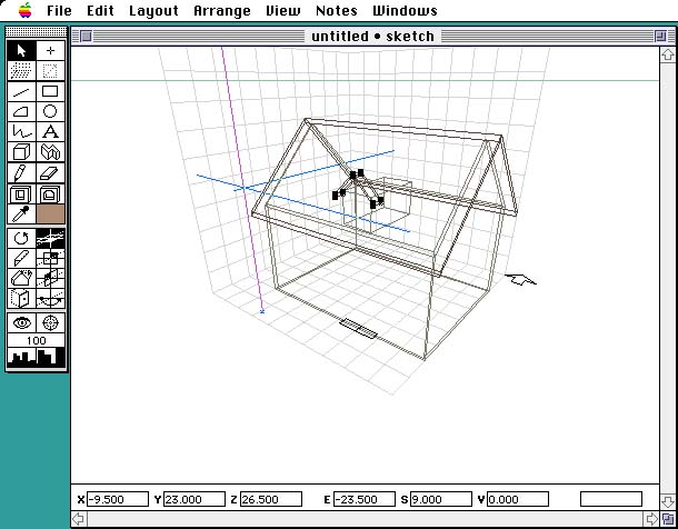 6. 上方へのオブジェクトの接合を行った後は、壁の一方の上端が屋根より上に飛び出しているので、トリムツールを使って余分な部分を切り取ります。