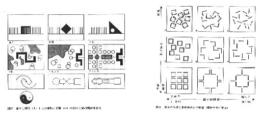 西洋と東洋の世界観の違いは、<秩序>という概念の捉え方の違いとも考えられるでしょう。左図は、順に中国、フランス、イギリスの庭園構成を示したもので、順に、適合、対照、対立を現すとされています。右図は秩序体系と部分の種類の相関を示した図です。これらの図の中で、どのように対称を位置づければよいか考えてみてください。