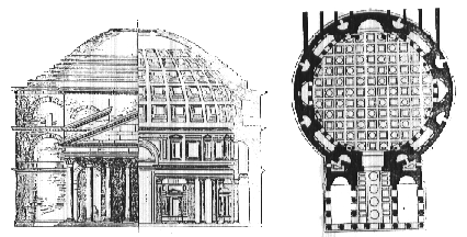 対称性を建築の中に仕組むにはさまざまな方法があります。古代ローマのパンテオンではどうでしょうか。まずファサードはありふれた<左右対称>な構成をもっています。平面的にも完全に左右対称です。円形平面の内部空間には、直径43mの球が内接するようにできています。つまり、観念的には、あるいはデザイナーの思考の中では、全方向への対称性が考えられていることになります。