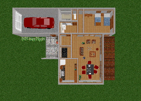 この空間構成から「事務室」の部分を取り去って、どこにでもありそうな住宅をつくってみました。