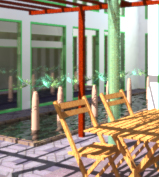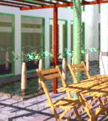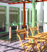 512*512でレンダリングした画像を一部切り抜き、jpeg最高画質で圧縮したものなので、多少画像が崩れていますが、樹木の葉、建具、椅子などを見れば、違いが分かると思います。QUALITY=High の場合は確かにきれいなのですが、レンダリングに数倍から数十倍の時間を要します。